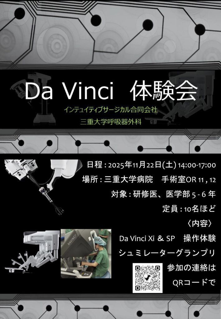 2025年10月3日 / 最終更新日時 : 2025年10月19日 ito-d.med イベント 2025.11.22 呼吸器外科Da Vinci 体験会を開催予定 2025年11月22日に呼吸器外科Da Vinci 体験会を開催します。 手術用ロボット「da Vinci」の体験をしていただけます! 研修医、学生の方向けとなっております。たくさんのご応募・ご参加をお待ちしております! Follow me! FacebookXHatenaPocketCopy