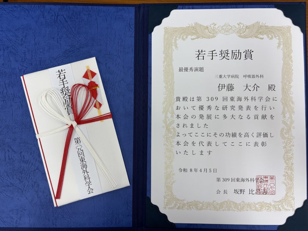 2026年4月6日 / 最終更新日時 : 2026年4月6日 ito-d.med 論文 2026.04.05 第309回東海外科学会で伊藤大介Drが若手奨励賞/最優秀演題を受賞 2026年4月5日に第309回東海外科学会が開催され、伊藤大介Drが若手奨励賞/最優秀演題を受賞しました。 \ 最新情報をチェック / FacebookXBlueskyHatenaCopy